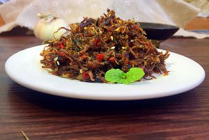 菜籽油烧7成热,放牛肉丝入锅炸至金黄,