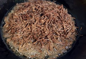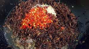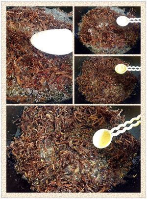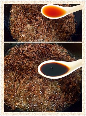 放入牛肉丝炒,一直炒干变色,放入糖,芝麻!