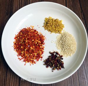 接下来准备炒牛肉丝佐料,姜末,花椒,干辣椒面,白芝麻,辣椒面,花椒可以根据自己口味,喜欢超级无敌麻辣可以多放些花椒和辣椒面!