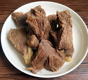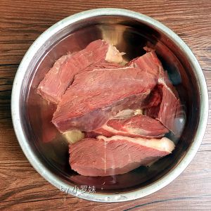 准备牛肉一斤,要选购牛腱子肉,有条纹的那种。