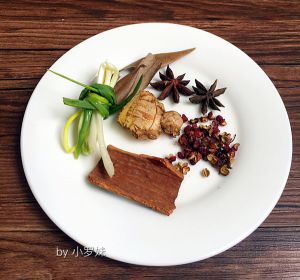 准备葱,老姜,香叶,八角,花椒,草果,桂皮。