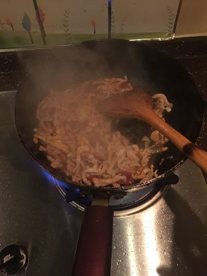 下肉丝煸炒,肉丝退生色后把肉拨到一边,锅里的油把豆瓣等炒香