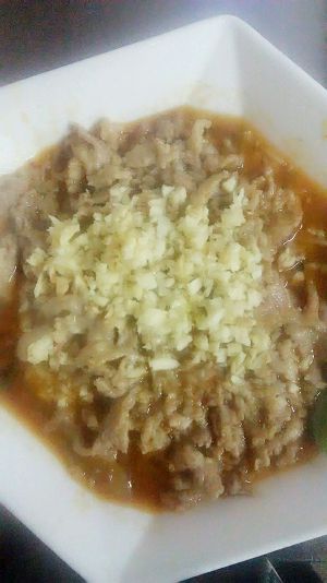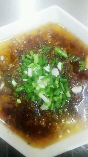 把炒好的干辣椒、葱末、蒜末放到肉片汤上,烧点热油浇在上面即可,大功告成。