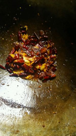 锅里放油烧热倒入切好的辣椒碎、花椒,干辣椒炒香铲起。
