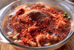 将锅洗净,加入适量油,加热到油冒烟。把事先准备好的辣椒,麻椒,和蒜末撒在肉片上。将热油均匀的椒在肉片上。