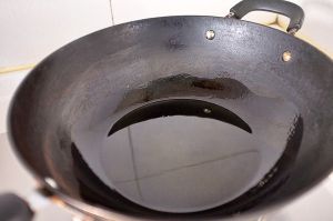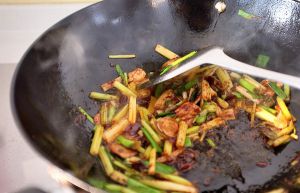 倒入少量油,待油热后,将切好段的红椒和麻椒放入锅中炒一下,闻到辣椒香后,将辣椒和麻椒捞出备用。