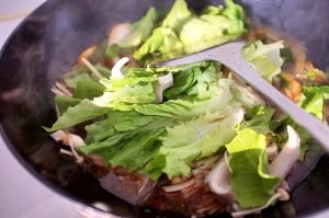 将洗好的白菜倒入锅中炒到七成熟,然后将白菜放到准备好的菜盆里。