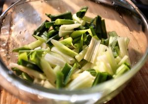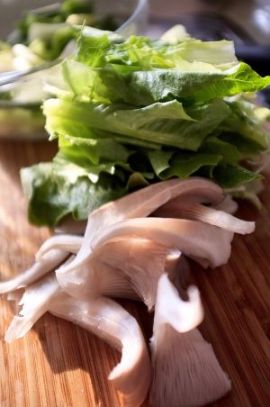 青笋尖连叶切片,烫熟,金针菇烫熟。铺在大碗底部。