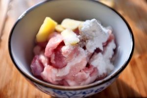 猪肉切片,用适量盐、淀粉腌制20分钟。