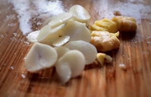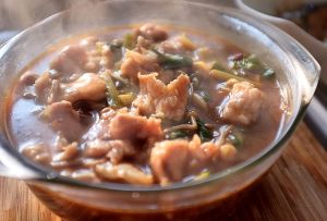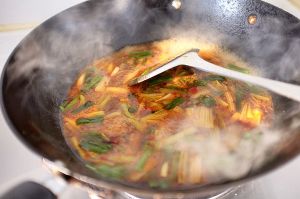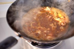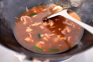 将锅洗干净,加入少许油。将切好的姜末放入锅中,然后加入两勺豆瓣酱。小火吵到闻到豆瓣的香味即可。然后加入清水,待水开后,倒入肉片。沸水煮五分钟即可,然后加入盐,酱油,鸡精,糖等调味。然后把肉片和汤倒入菜盆里。