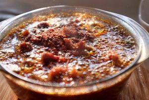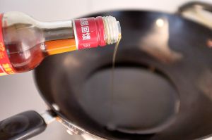 把锅中的油倒入装有菜肉的汤盆里,用筷子搅一下,大功告成