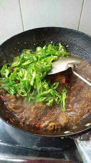 水分炒的差不多了,放鲜辣椒,继续翻炒(无视锅柄上的油腻子)