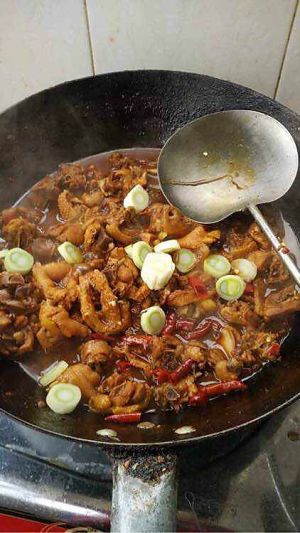 ]水分还剩下1/3时候,放葱花,改大火炒 (喜欢吃土豆片的朋友,这个时候放土豆)