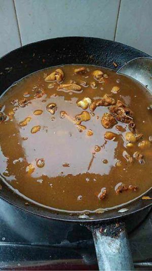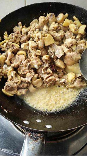 倒入热水,使水莫过鸡肉即可,大火改中小火,盖盖慢慢炖会,把鸡肉炖熟(注意一定要用热水,这样做出来的鸡肉更鲜美。)