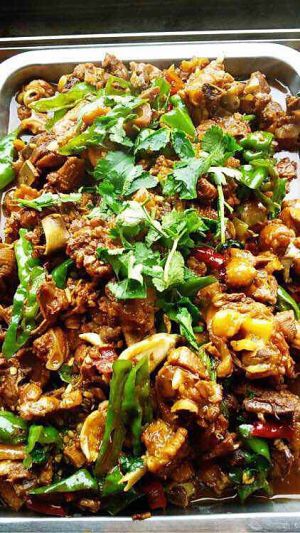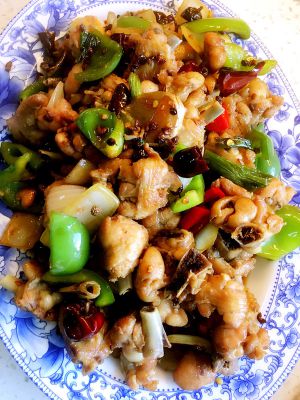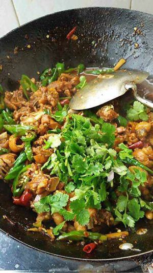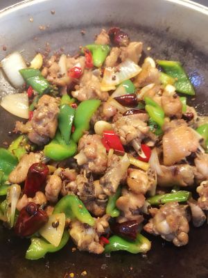 油锅热了先放葱姜蒜炝锅,然后倒入辣椒,炒出辣椒香味,约2-3分钟,再倒入腌制好的鸡肉,快速不断煸炒,此时因为有淀粉缘故可能会略有点粘锅,迅速倒入1勺海鲜酱油,改小火,继续煸炒,再加入1g盐,待水沫子炒干鸡肉完全变色即可出锅了!