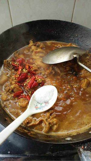 看水分还剩下2/3,放盐,干辣椒,继续盖盖烧制~~