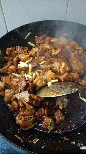 水分快干后,放入醋继续翻炒,醋中的水分炒的差不多了,放老抽和生抽,还有切好的姜丝,继续翻炒