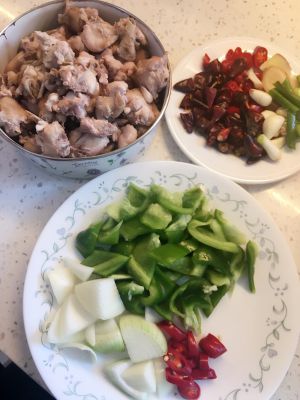 接下来就准备别的材料了,杭椒和鲜红辣椒切丁待用,并且准备好葱姜蒜的量切片,等待肉腌制好