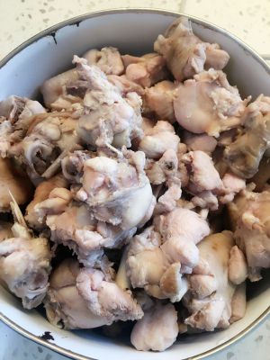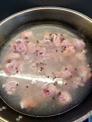 煮一锅开水,把腌好的鸡块放入,飞水,去腥