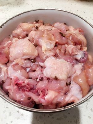鸡肉切丁,腌制调料:盐1g,(我用的鸡丁少所以调料少),姜粉1g,生抽2勺,淀粉1勺,一定要最后一步放淀粉,