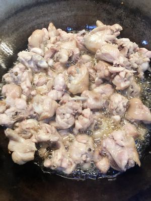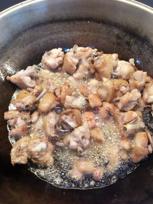 锅中加油,腌制好的鸡肉过油翻炒至8成熟盛出