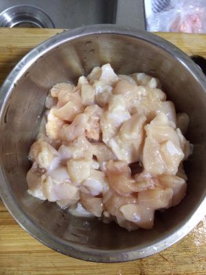鸡胸肉切丁,加一勺料酒,一勺淀粉,半勺生抽腌制10分钟