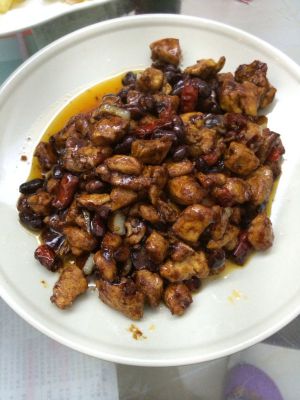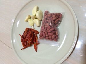 然后装起大部分油留一小部分~加热~放入干辣椒蒜片爆香~然后倒入刚炸好的花生米鸡丁~翻炒片刻后加入老抽上色~最后加入糖和鸡精~