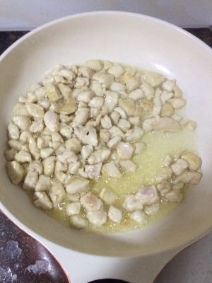 炒锅放油八成热,爆葱姜蒜,放入鸡丁翻炒变色盛出