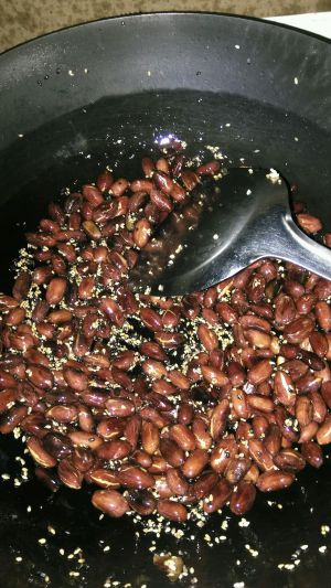 花生熟的差不多的时候,再加入一勺的油,撒上适量的花椒粉、辣椒粉、食用盐、十三香、味精和给白芝麻,翻炒均匀