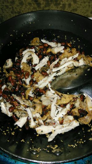 倒入备好的鸡肉条,翻炒一两分钟