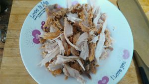冷却后,将鸡腿肉用手撕下,注意,鸡肉不要撕得太小块,炒的过程容易掉!