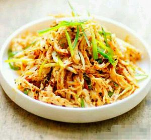 丝好的鸡肉加入葱和香菜还有调好的酱料抓拌均匀即可开吃