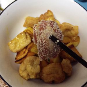 红薯煎至外表焦黄,我家刚好还有几块油豆腐就一起垫底了。肉片在米粉里打个滚,沾满米粉