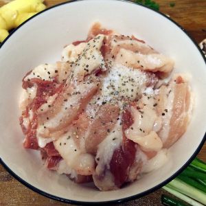 加入适量花生油,生抽,食盐,蚝油,生粉。抓匀静置腌制。