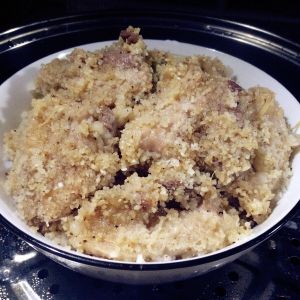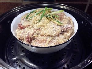 将腌好的肉用蒸肉米粉拌匀,最后再在上面洒满蒸肉米粉。