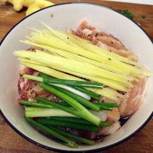 将排骨中分别加入料酒,老抽,生抽(1:1:2),然后加入姜丝,搅拌均匀,腌制一个半小时