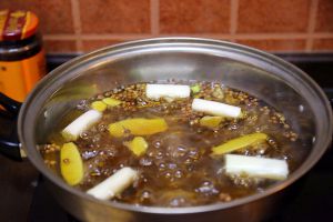 锅里加清水,烧开后加入刚刚准备的材料。加半勺老抽,2勺料酒混成汤汁,煮3分钟。