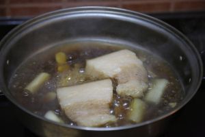 煮到用筷子可以轻易戳穿五花肉就可以捞起!