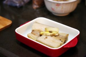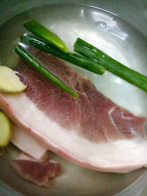 五花肉洗干净放入开水煮,水中可以加点生姜,大料和花椒,料酒!