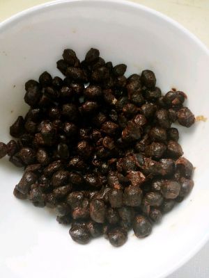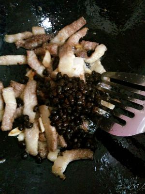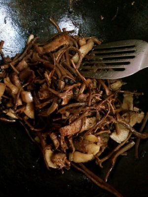 再放入茶树菇翻炒,可淋少许水,加入少量的盐,豆豉本身含有盐了,加入糖后大火翻炒。