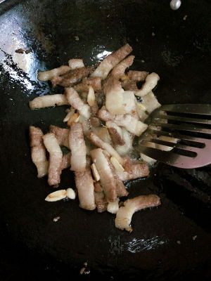 猪肉下锅焯水成型切薄片,然后下锅放两片姜和几颗花椒煸炒到肉稍干,捞起肉片留油在锅里