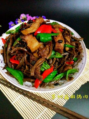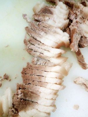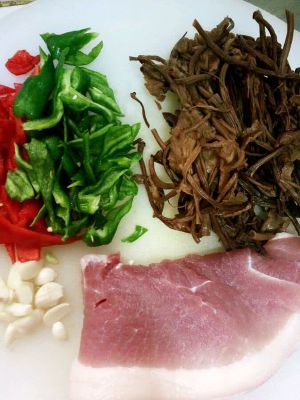 青椒切丝,干辣椒切碎,猪肉煮十分钟切薄片,郫县豆瓣酱备用