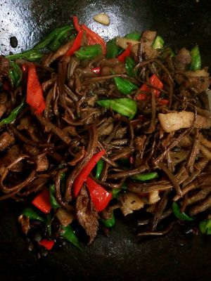 最后,放入切好的青椒丝,翻炒片刻,出锅即可