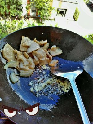 倒油把五花肉炒透,再把蒜头倒入炸出香味……这时候(在加入盐)让盐融化才有味道喔……
