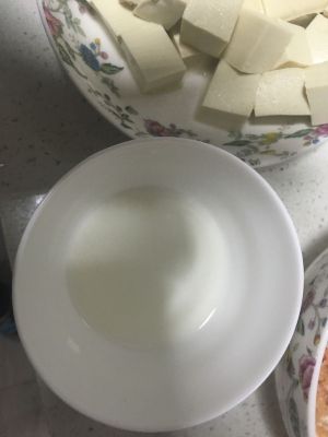 放入沥过水的豆腐,煮2分钟,放入盐。生粉加水调成水淀粉,倒入1半,小心搅匀。