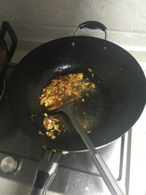 热锅中加入少量油,热油后加入豆瓣酱,加入姜蒜末翻炒