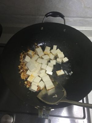 加入豆腐翻炒,依次加入肉末,倒入水淀粉,翻炒熟之后起锅