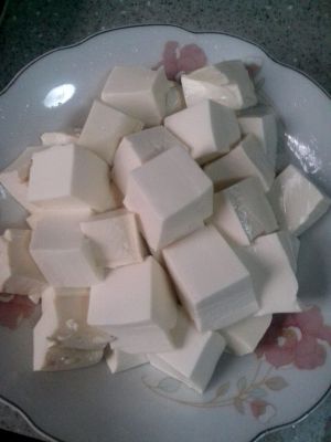1. 将豆腐切成2厘米见方的块,放入加了少许盐的沸水中汆一下,去除豆腥味,捞出用清水浸泡