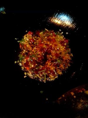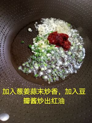 锅里烧热油下花椒,蒜,葱花,郫县豆瓣酱煸香
