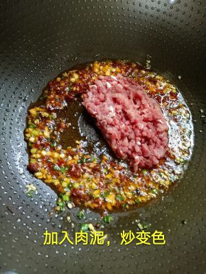 爆葱蒜,放肉馅翻炒,放郫县豆瓣酱翻炒